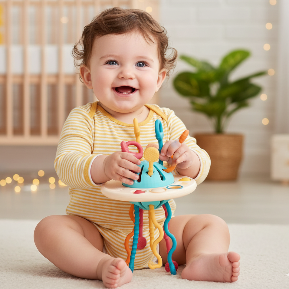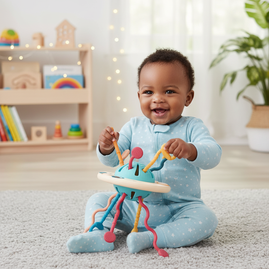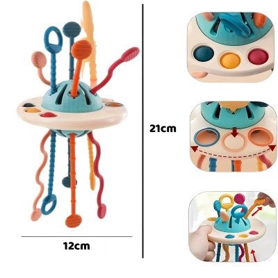 Babys lieben es, Dinge zu greifen & zu bewegen. Das UFO-Sensorik-Spielzeug bietet Push & Pull Spaß, trainiert Koordination und beruhigt unterwegs – Montessori pur!